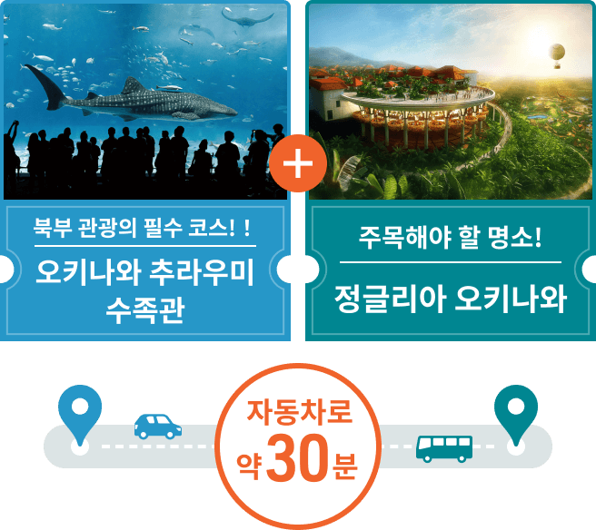 JUNGLIA OKINAWA(정글리아 오키나와)와 오키나와 츄라우미 수족관 등 인기 있는 명소를 중심으로 오키나와 북부를 마음껏 즐길 수 있는 여행을 떠나 보세요