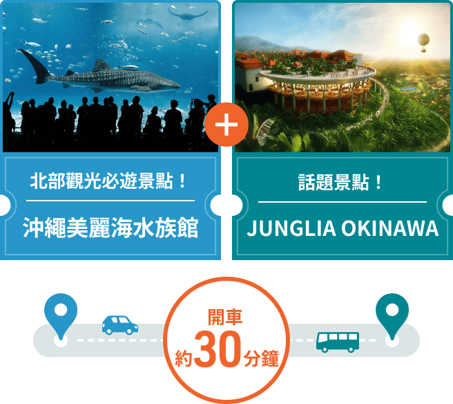 在 JUNGLIA OKINAWA(叢林亞樂園)與沖繩美麗海水族館等熱門景點,盡享沖繩北部之旅